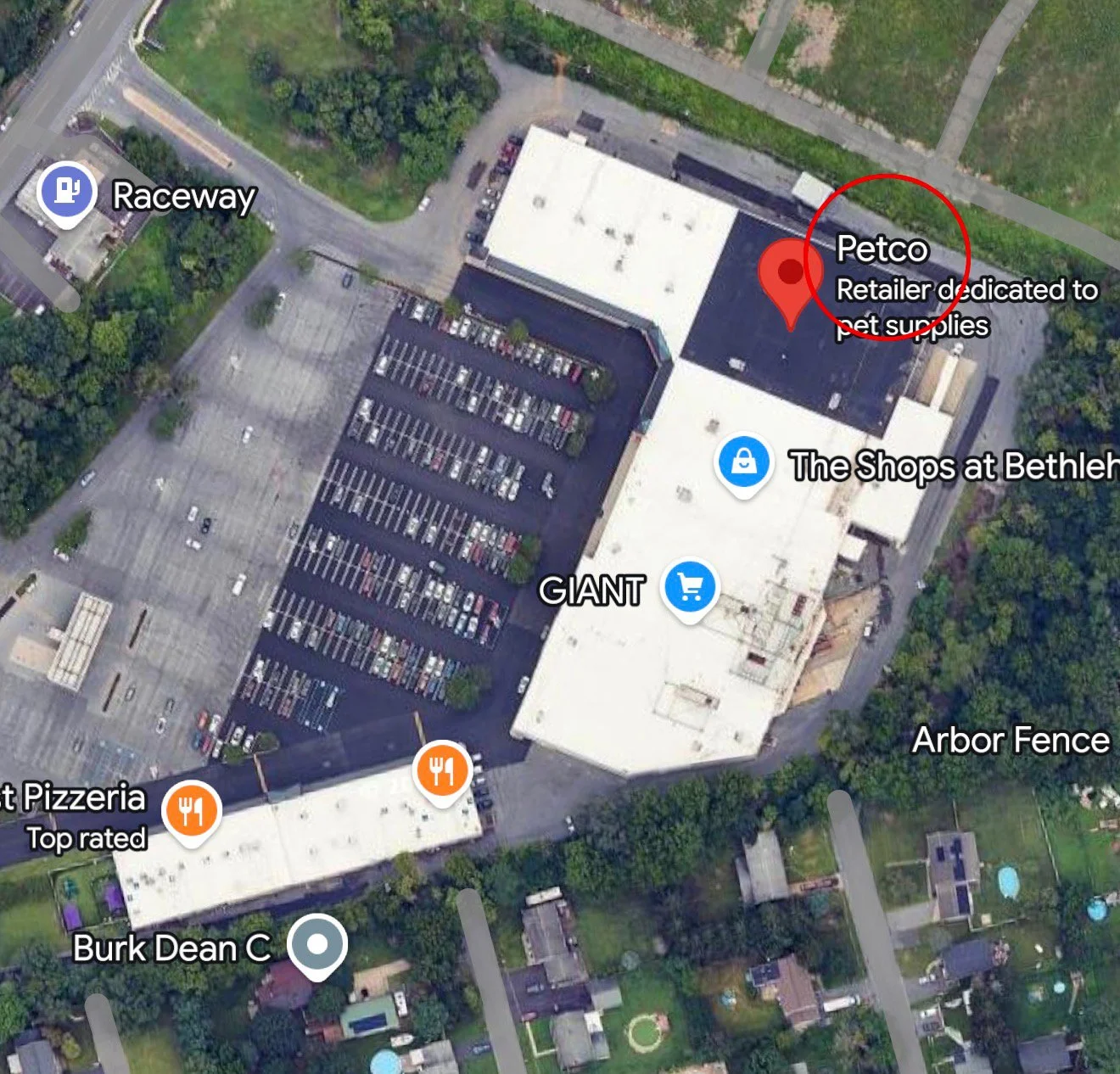 Behind the building (Red Circle), there are dark gray double doors. This is where we are located.